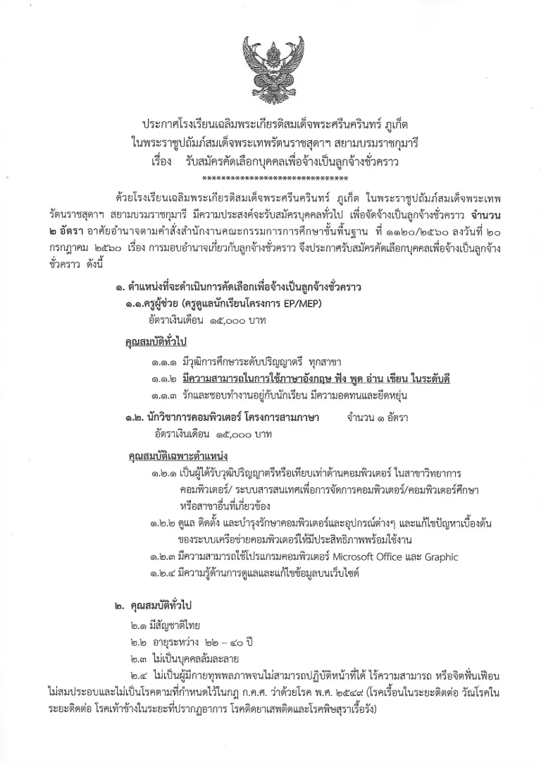 ประกาศรับสมัครลูกจ้างชั่วคราว ตำแหน่ง ครูดูแลนักเรียนโครงการ EP/MEP และ นักวิชาการคอมพิวเตอร์