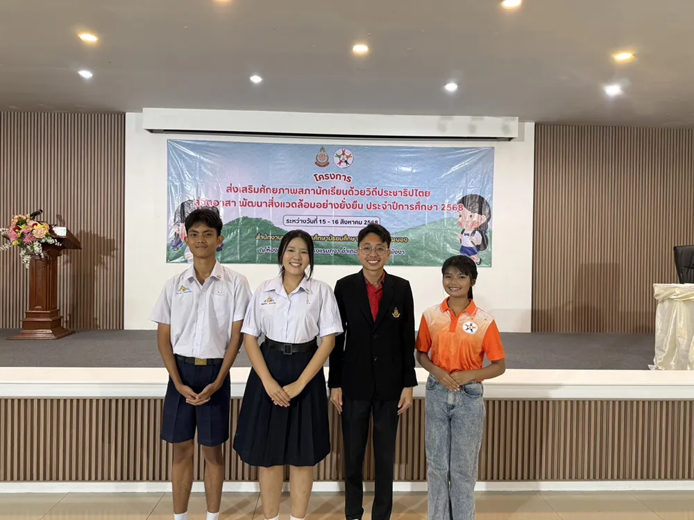 วันศุกร์ที่ 15 สิงหาคม 2568 ดร.ณัฐญาพร เสวตานนท์ ผู้อำนวยการโรงเรียนเฉลิมพระเกียรติสมเด็จพระศรีนครินทร์ ภูเก็ต ในพระราชูปถัมภ์สมเด็จพระเทพรัตนราชสุดาฯ สยามบรมราชกุมารี มอบหมายให้นายอันดามัน สันติอภิรักษ์ หัวหน้างานส่งเสริมประชาธิปไตยในโรงเรียนและสภานักเรียน ตัวแทนคณะกรรมการสภานักเรียนเข้าร่วมโครงการส่งเสริมศักยภาพสภานักเรียนด้วยวิถีประชาธิปไตย สู่จิตอาสา พัฒนาสิ่งแวดล้อมอย่างยั่งยืน ณ โรงแรมภูงา จังหวัดพังงา