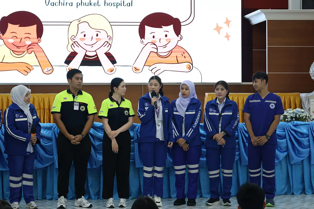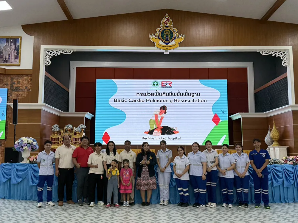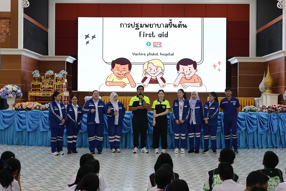 วันเสาร์ที่ 16 สิงหาคม 2568 ดร.ณัฐญาพร เสวตานนท์ ผู้อำนวยการโรงเรียนเฉลิมพระเกียรติสมเด็จพระศรีนครินทร์ ภูเก็ต ในพระราชูปถัมภ์สมเด็จพระเทพรัตนราชสุดาฯ สยามบรมราชกุมารี พร้อมด้วยคณะครูกลุ่มสาระการเรียนรู้สุขศึกษาและพลศึกษา นำนักเรียนเข้าร่วมโครงการ การฝึกอบรมการช่วยชีวิตขั้นพื้นฐาน (CPR) และการปฐมพยาบาลเบื้องต้น (สำหรับนักเรียน) รุ่นที่ 1 และรุ่นที่ 2 ประจำปีการศึกษา 2568 ระหว่างวันที่ 16 – 17 สิงหาคม 2568 โดยได้รับเกียรติจากกองทุนหลักประกันสุขภาพท้องถิ่น เทศบาลตำบลวิชิตในการสนับสนุนและเป็นวิทยากรบรรยายความรู้ให้กับนักเรียน ณ ห้องประชุม 120 ปี สมเด็จย่า หอประชุมประดู่แดง โรงเรียนเฉลิมพระเกียรติสมเด็จพระศรีนครินทร์ ภูเก็ต ในพระราชูปถัมภ์สมเด็จพระเทพรัตนราชสุดาฯ สยามบรมราชกุมารี